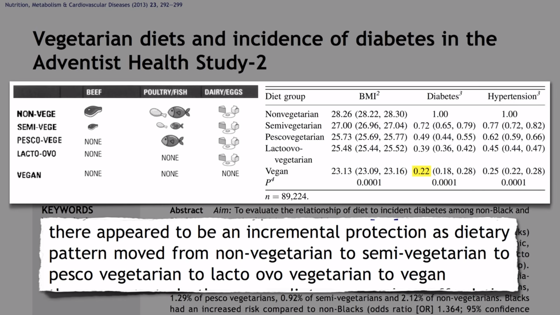 Nochmal, beide Testgruppen aßen überwiegend gesund, zB keine Soft Drinks in beiden Gruppen. Trotz der Ähnlichkeiten der Gruppen, wie Gewicht, Familienanamnese, Bewegung und Rauchen, hatten Männer die sich vegetarisch ernährten nur die Hälfte an Diabetesvorfällen, und Frauen nur ein Viertel. Also, auch bei einer Population die sich überwiegend pflanzenbasierend ernährt, mit nur wenig Fleisch und Fisch, haben echte Vegetarier, die tierische Produkte ganz meiden, wieder deutlich weniger Prädiabetes und Diabetesvorfälle.