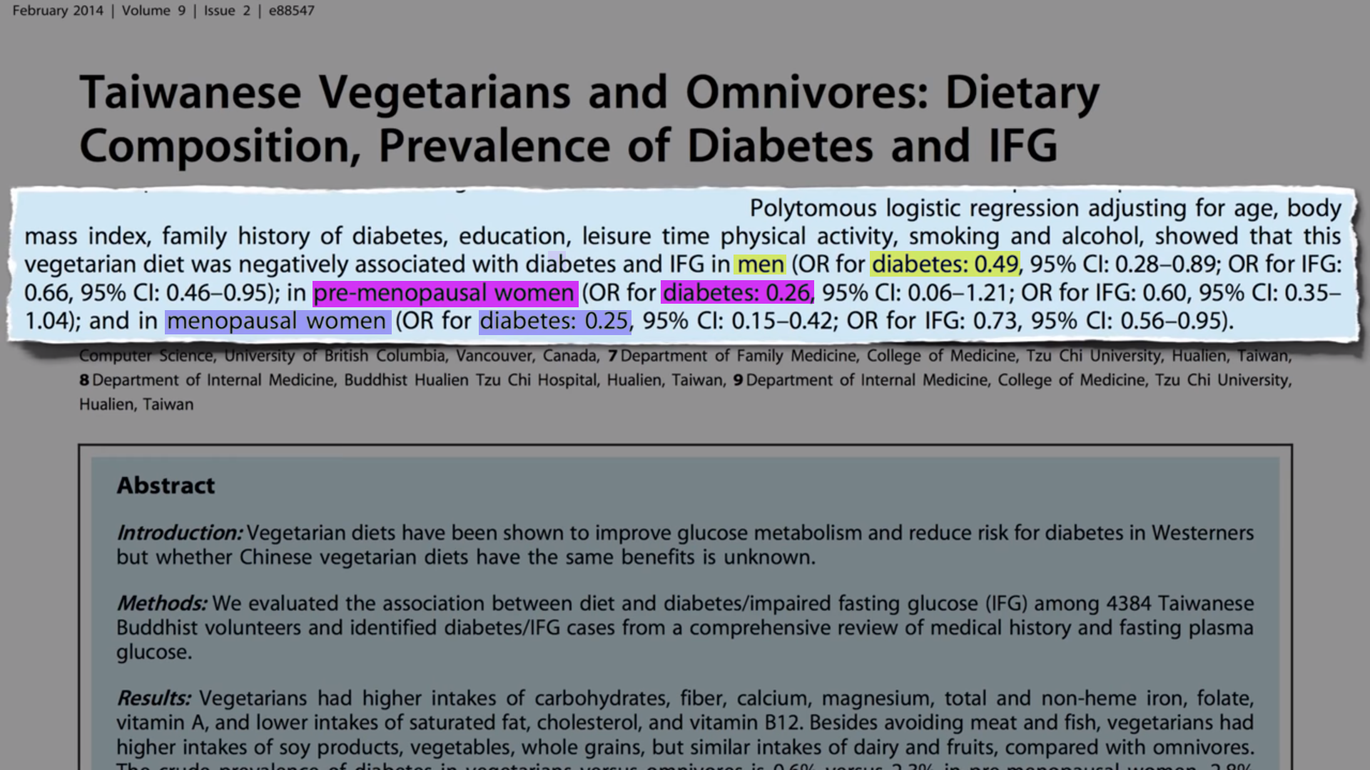- T H T Chiu, H Y Huang, Y F Chiu, W H Pan, H Y Kao, J P C Chiu, M N Lin, C L Lin. Taiwanese Vegetarians and Omnivores: Dietary Composition, Prevalence of Diabetes and IFG. PLOS February 2014 Volume 9 Issue 2.