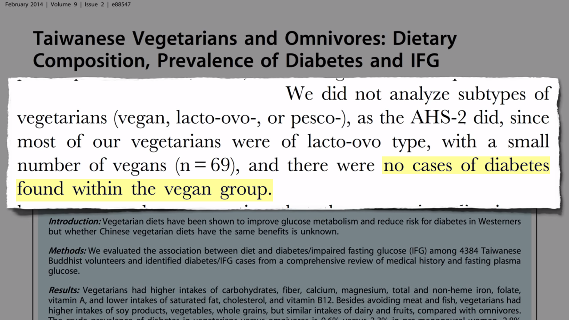 Man versuchte auch, wie in der Adventis 2 Studie, die Testgruppen in Veganer und Ovo-Lacto Vegetarier zu trennen, aber man fand absolut keine Vorfälle an Diabetes unter den Veganern.