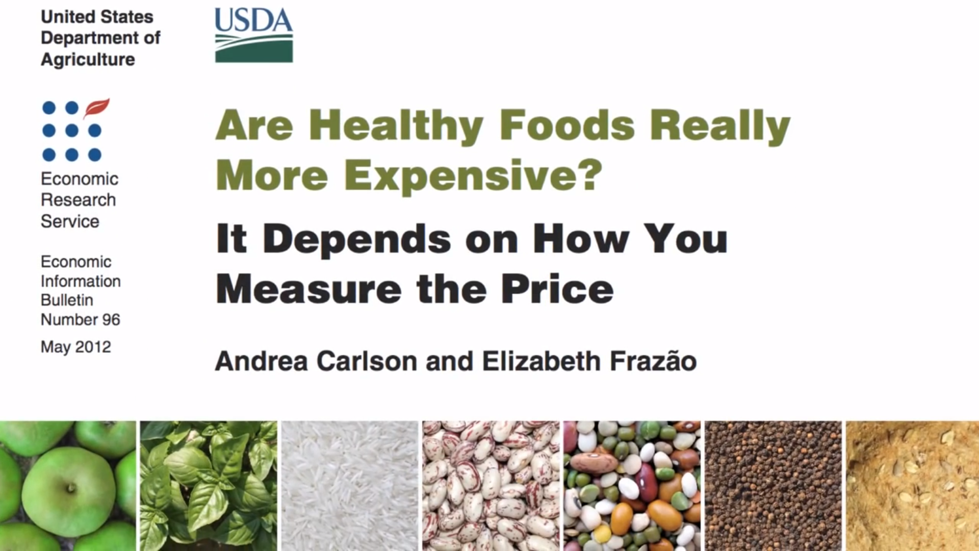 - Carlson, Andrea, and Elizabeth Frazão. Are Healthy Foods Really More Expensive? It depends on How You Measure the Price, EIB-96, U.S. Department of Agriculture, Economic Research Service, May 2012.