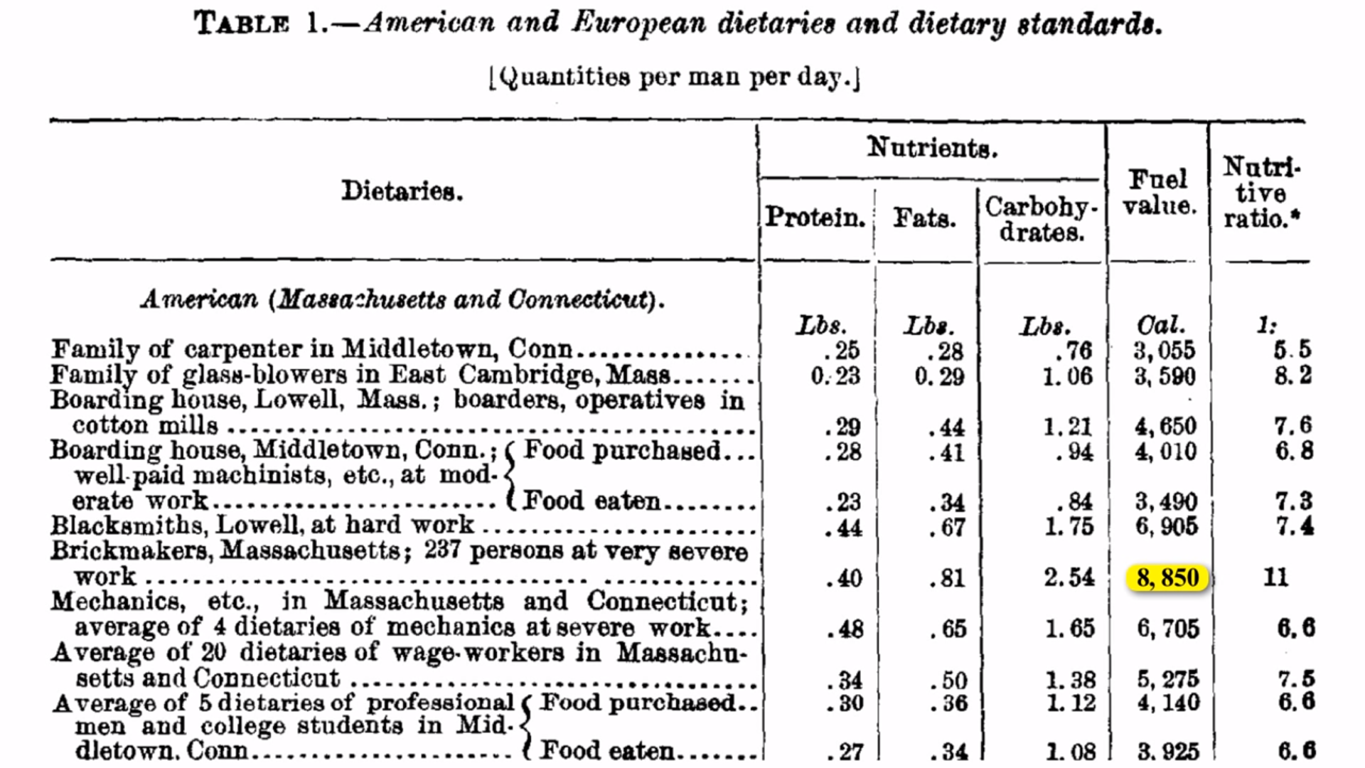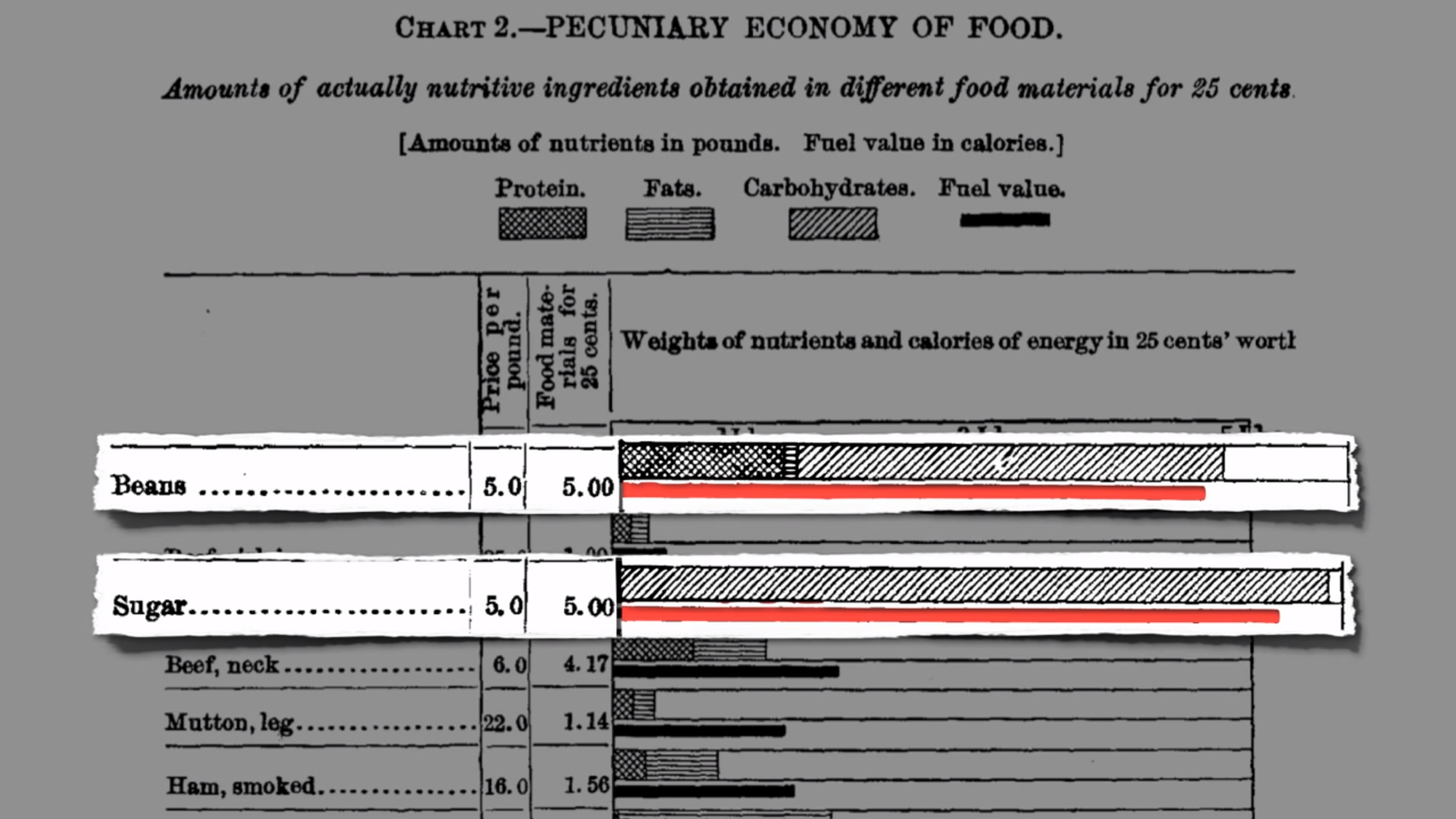 Beispiel, hatte einen täglichen Energiebedarf von über 8000 Kalorien, demnach lag die Betonung auf billigen Kalorien. Obwohl damals Bohnen und Zucker ungefähr das gleiche gekostet haben, hat Zucker mehr „Treibstoff“ geliefert, also mehr Kalorien pro Portion.