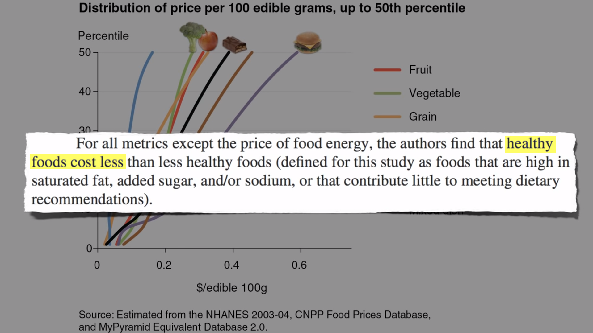 Aber wenn man Lebensmittelkosten pro Portion oder pro Kilo vergleicht, sind Obst und Gemüse tatsächlich billiger. Bei allem Vergleichen, außer bei Kosten pro Kalorie, schneiden gesunde Lebensmittel billiger ab als weniger gesunde Lebensmittel.