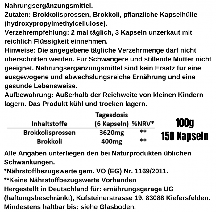 Es enthält unter anderem Sulforaphan in hoher Dosis (laborgeprüft, je nach Charge enthält 1 Gramm mindestens 9.5mg Sulforaphan). Laut der angegebenen Tagesdosis von 4g, kommt man mindestens auf 38mg Sulforaphan.